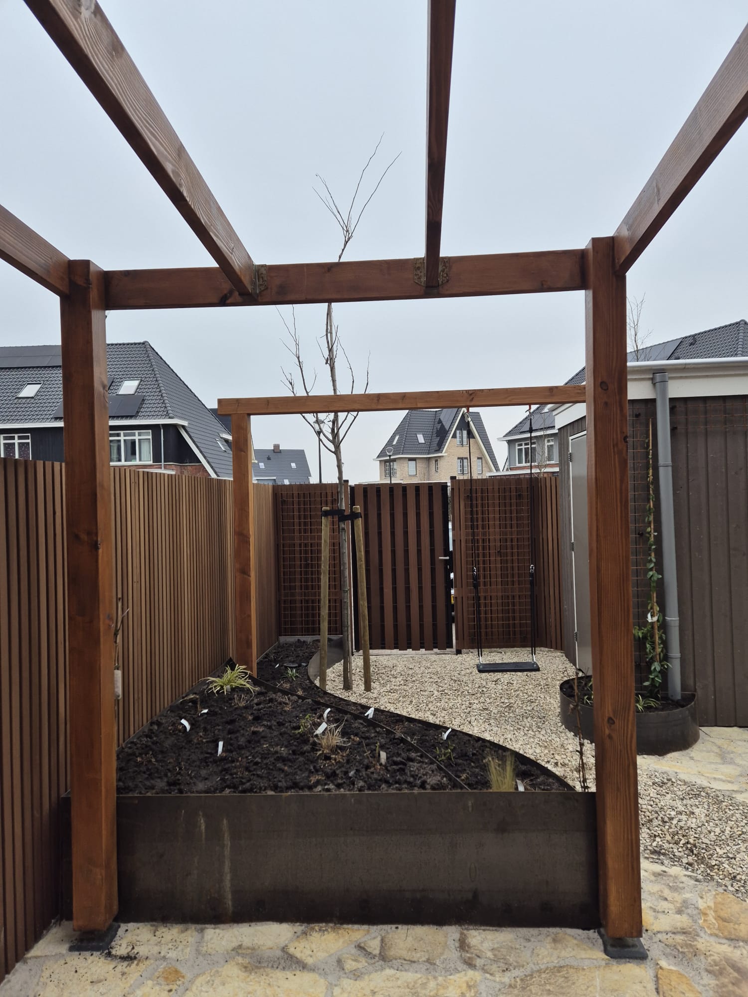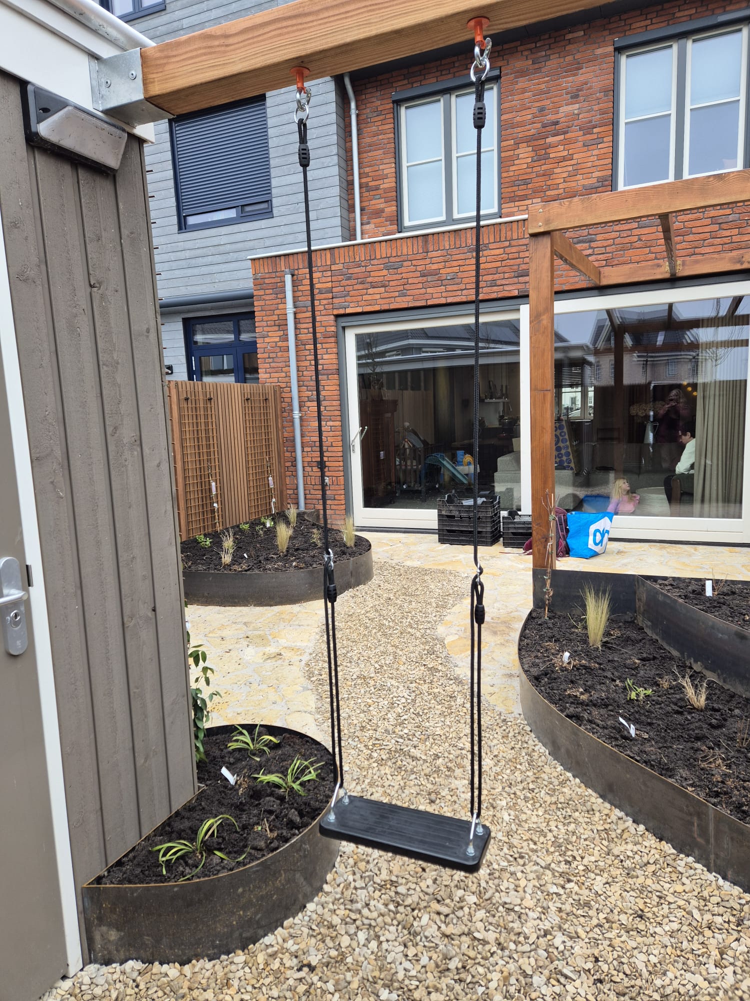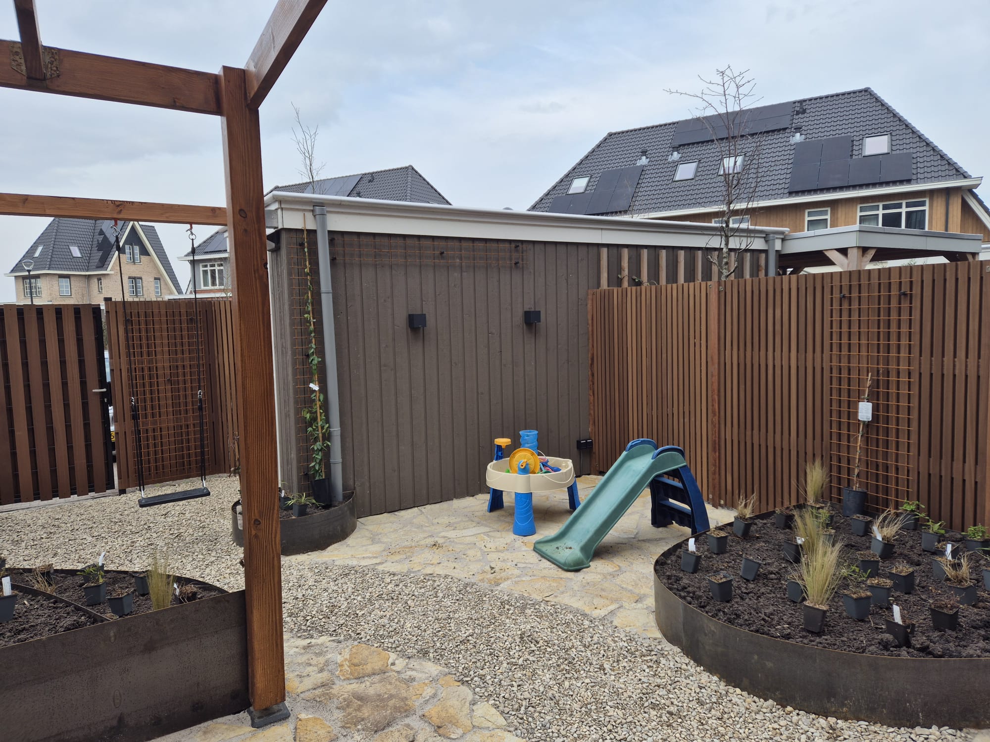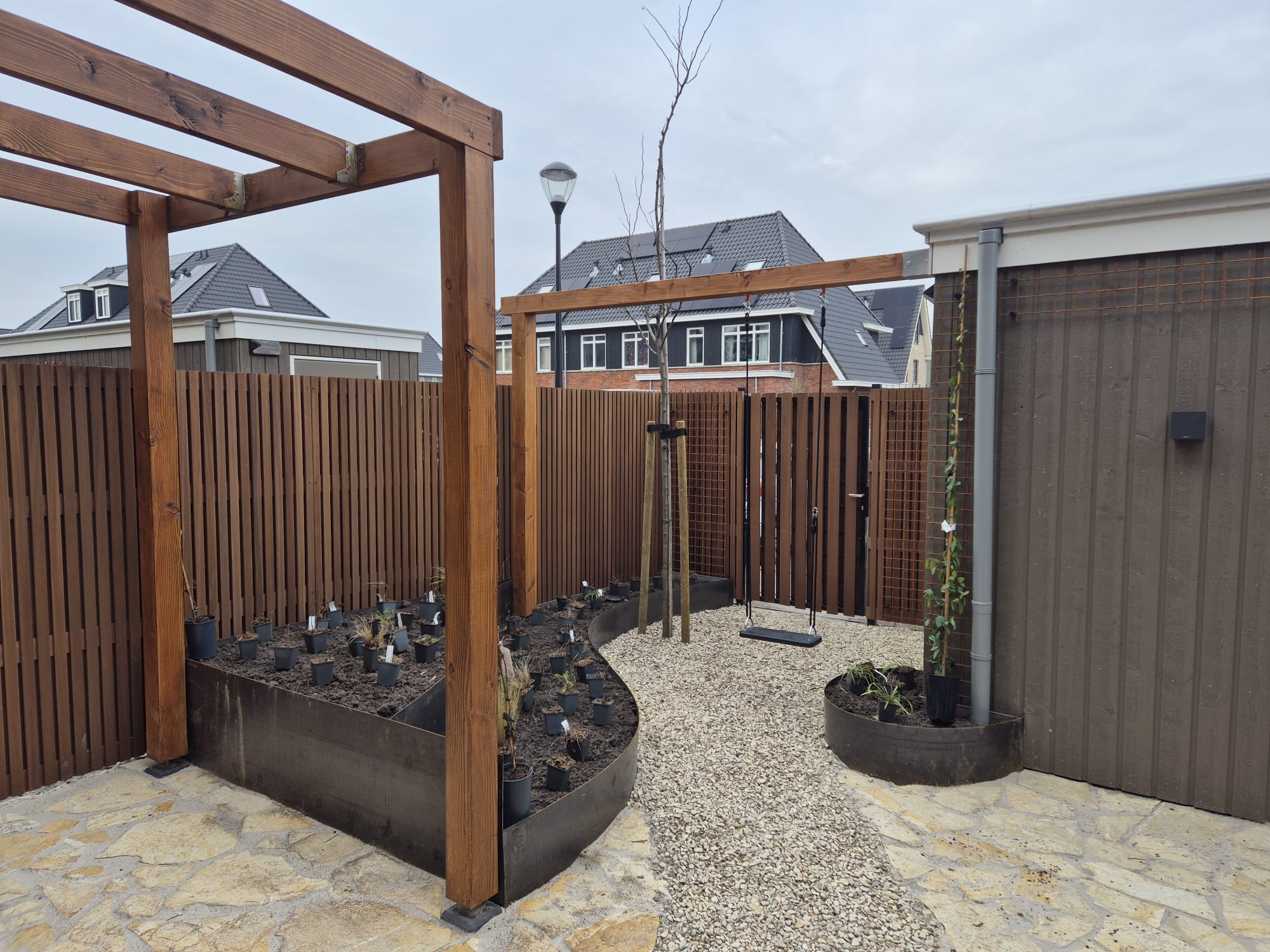 De grootste wens was een pergola aan het huis. Omdat de tuin op het noorden ligt en er al een schuur in de tuin staat, heb ik er bewust voor gekozen voor de pergola over de halve breedte te plaatsen, precies boven de loungebank. Zo creëren we borgenheid zonder dat het te massief wordt of te duur licht uit de woning wegneemt. Een schommel aan de pergola zorgde voor een extra speelelement voor de kinderen.